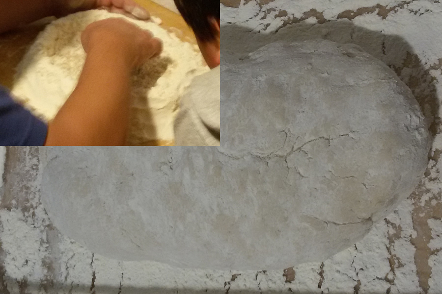 Das Mehl auf ein Brett oder in eine Schüssel geben und dann von der Mitte heraus einen "Damm" bauen sodass in der Mitte ein See entsteht, der ca. 15 cm Durchmesser hat. Das Wasser hineingeben (Zunächst nicht zu viel, weil man überschüssiges Wasser so schlecht wieder heraus bekommt, zu wenig Wasser aber einfach zu kompensieren ist) und die Hefe hineinbröseln.
