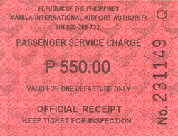 Zu guter Letzt wird bei der Ausreise dann noch die "Passanger Service Charge" fällig. 2006 betrug sie 550,00 Pesos, die vor dem Abflug in baren Pesos oder USD bezahlt werden kann.