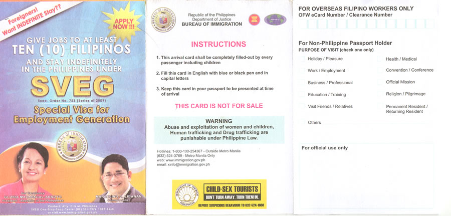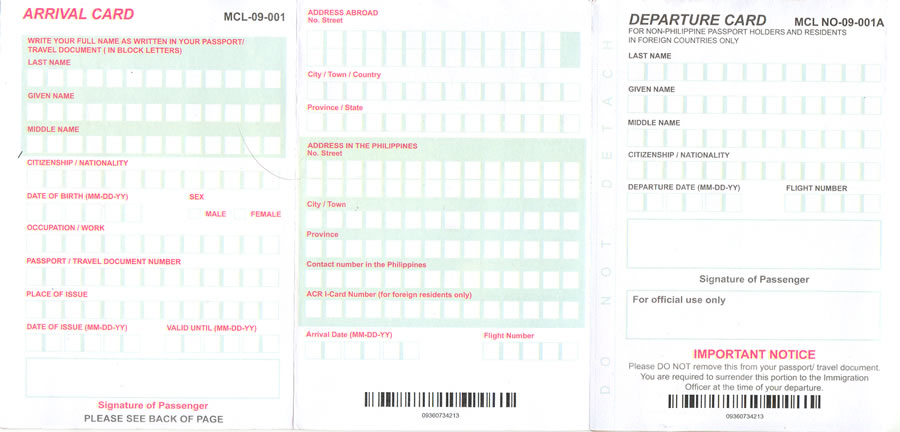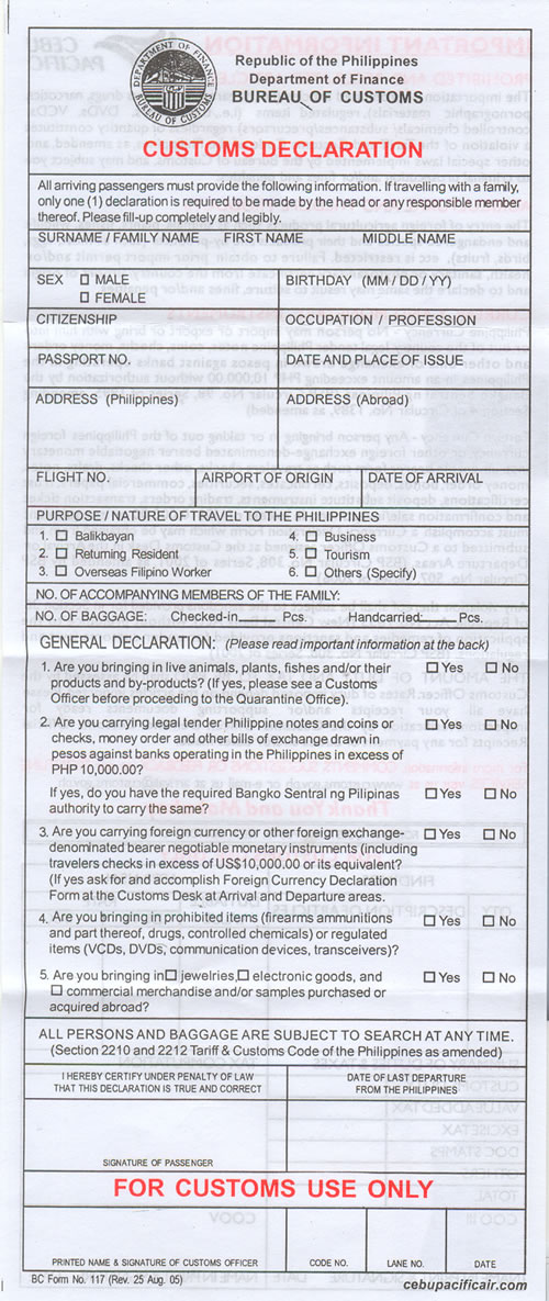 Natürlich muss jeder Einreisende eine Einreisekarte / Zolldeklaration ausfüllen, wie man es aus allen Ländern Asiens kennt. Besonders freuen sich die Customs, wenn man Waffen, Drogen und Pornos aufführt und mehr als 10.000,00 philippinische Pesos ein- oder später ausführt. Wer sich das schon vor dem Visaantrag überlegt, kann neben den Flug-, auch noch die Visakosten sparen. Geldbeträge über USD 10.000,00 müssen deklariert werden.