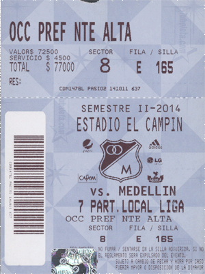 Das avisierte Einkaufszentrum ist ein Adidas Sportgeschäft und verkauft keine Tickets mehr, schickt mich aber 200 Meter weiter zum nächsten Sportgescchäft, das auch keine Tickets verkauft, aber nur 50 Meter von einem Loch in der Mauer entfernt ist, wo es die begehrten Papiere gibt. Ich erstehe für 77.000 COP (~30 €) einen Tribühnen Sitzplatz unter dem schmalen Dach, direkt unter den Reporterkabinen. Für Fussball im Regen bin ich doch schon zu alt. Alles gut!